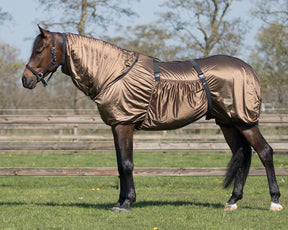Deze eczeemdeken is voorzien van een vaste hals met elastische afsluiting, een brede buikflap met elastische, verstelbare singels en een ruime staartflap. De deken heeft kunststof sluitingen, en heeft een sluiting tussen de voorbenen voor de bevestiging van de buikflap. Uit onderzoek blijkt dat de zebraprint vliegen op afstand houdt doordat de gestreepte patronen licht reflecteren. De reflectie werkt irriterend voor insecten.
