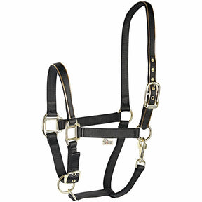 Luxe, softnylon halster met gouden bies om kopstuk en neusriem. Goudkleurige fournituren, gaatjes voorzien van ringen. Verstelbaar bij kopstuk en keel. Materiaal: Nylon