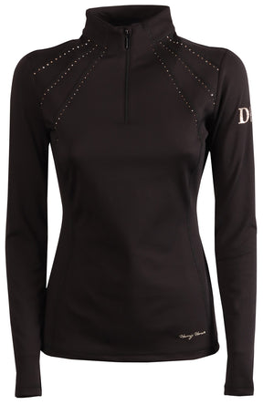 Shirt met lange mouw, opstaande kraag met korte rits. Aan de bovenkant aan de voorzijde van het shirt zijn naast de sierstiksels rijen met kristallen in verschillende formaten geplaatst en het Denici Cavalli logo op de linkermouw.