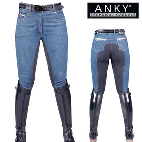 ANKY® Stonewash denim broek heeft voor- en achterzakken met een rits aan de achterkant. De rijbroek is afgewerkt met strass steentjes aan de voorkant in de rechter zak.