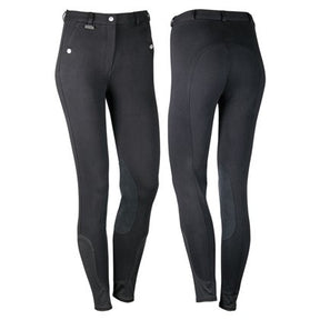 Rijbroek met steekzakken met drukknoopsluiting, schuifgesp sluiting en rits, riemlussen, elastische kunstlederen kniestukken en elastische inzet onderaan de broekspijp.