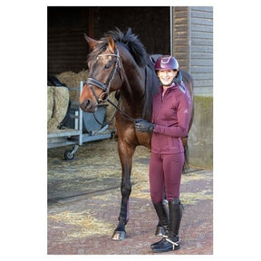 Paardrijlegging met hoge tailleband voorzien van riemlussen, twee zakken met een ritssluiting, rondgenaaid zitvlak met siliconen print en een elastische inzet rond de enkels voor meer comfort in je paardrijlaarzen.