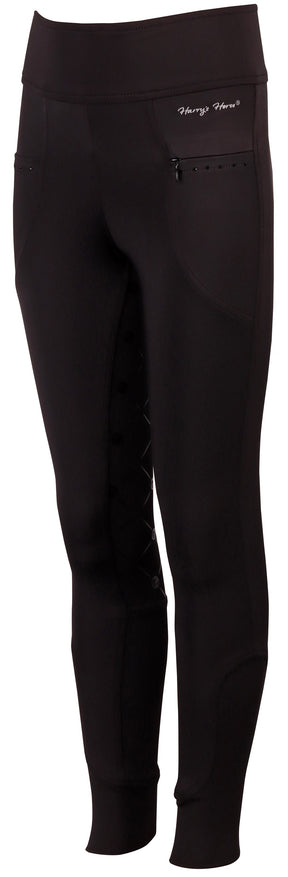 Paardrijlegging met twee zakken waarvan een met ritssluiting, kristallen details, zitvlak voorzien van een siliconen print voor extra grip in het zadel en met een elastische inzet rond de enkels.