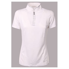 Wedstrijdshirt met korte mouw en een opstaande kraag met korte ritssluiting. De kraag en de ritssluiting zijn rondom gedecoreerd met kristallen.