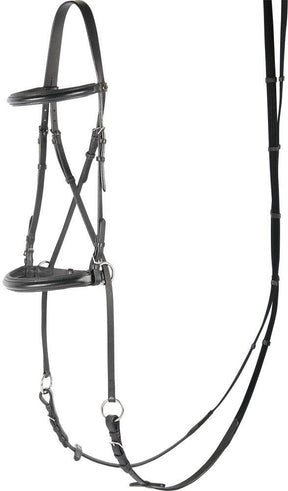 Gebissloses Zaumzeug aus Leder mit gepolstertem Stirn- und Nasenriemen, Gurtzügel mit Anschlägen. Zügel über Kinn und Hals kreuzen. Wird mit Anleitung geliefert.