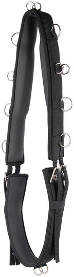 Longiergurt mit Sharkskin-Neopren-Innenfutter. Die Rillen in der Haifischhaut sorgen für zusätzliche Belüftung und Schweißableitung. Der Longiergurt hat 12 Ringe, davon 2 unten. Beidseitig verstellbar mittels Rollschnallen.