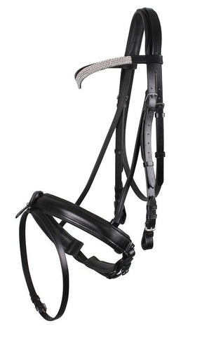 Elegantes Zaumzeug in Sondergröße für Kaltblutpferde, ausgestattet mit einem Nasenriemen mit komplett abnehmbarem Sperrriemen. Mit V-förmigem Stirnband, das