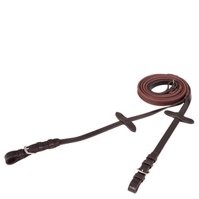 Mit Nylon verstärkte Gummigriffzügel mit Lederzügelstoppern, 16 mm breit. Die Lederenden mit Edelstahl-Schnallenverschlüssen sind ebenfalls 16 mm breit.