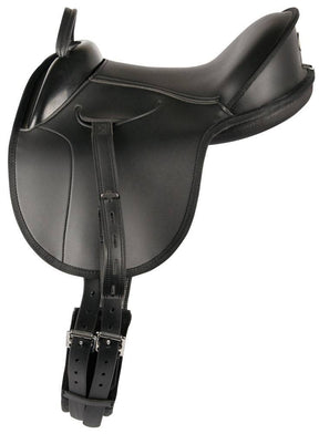Leichter Ponysattel für junge Reiter, ausgestattet mit einer Handschlaufe und D-Ringen zur Befestigung eines Schweifriemens. Der Sattel besteht aus robustem Kunstleder-Look und ist daher sehr pflegeleicht.