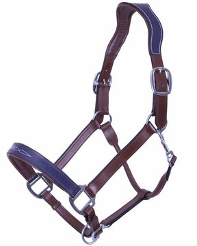 Luxuriöses Lederhalfter mit zwei Lederfarben und doppelt verstellbarem anatomisch geformtem Genickstück. Abgerundet wird das Ganze durch weiße Ziernähte am Nasenriemen und am Genickstück, die beide mit einer weichen Polsterung versehen sind. Ausgestattet mit einem Schnappverschluss und einem verstellbaren Nasenriemen.