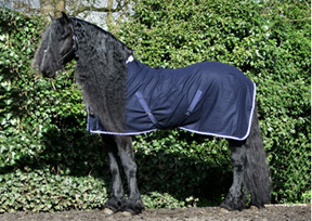 Eine Decke aus wunderschöner, dicht gewebter dunkelblauer 1000-Gramm-Wolle mit Sattelgurten und Beinschnüren. Ideal auch für den Transport. Eingefasst mit original friesischer Paspelierung.