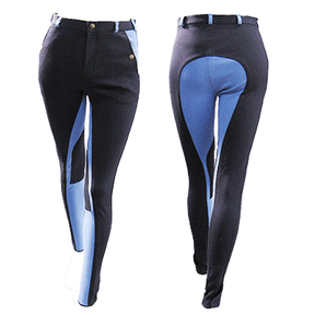 Luxuriöse Kinderreithose mit Seitentaschen, Gesäß, Gürtelschlaufen und Innenseite der Seitentaschen in Kontrastfarbe. Farbe; blau / babyblau 95 % Baumwolle und 5 % Lycra. Mit elastischem Beinabschluss