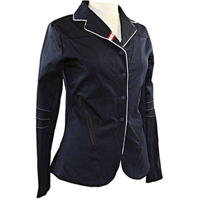 Schicke Reitjacke mit doppeltem Schlitz, kontrastfarbener Paspelierung, Druckknöpfen und Reißverschluss, 2 Taschen mit Reißverschluss und dezent eingearbeiteten „Stars and Stripes“ auf Vorder- und Rückseite. Material: Elasthan, Mikropolyester und Coolmax.
