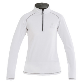 Weißes Showshirt mit Strasssteinen am Kragen und im Reißverschluss. 88 % Polyester, 12 % Elastan.