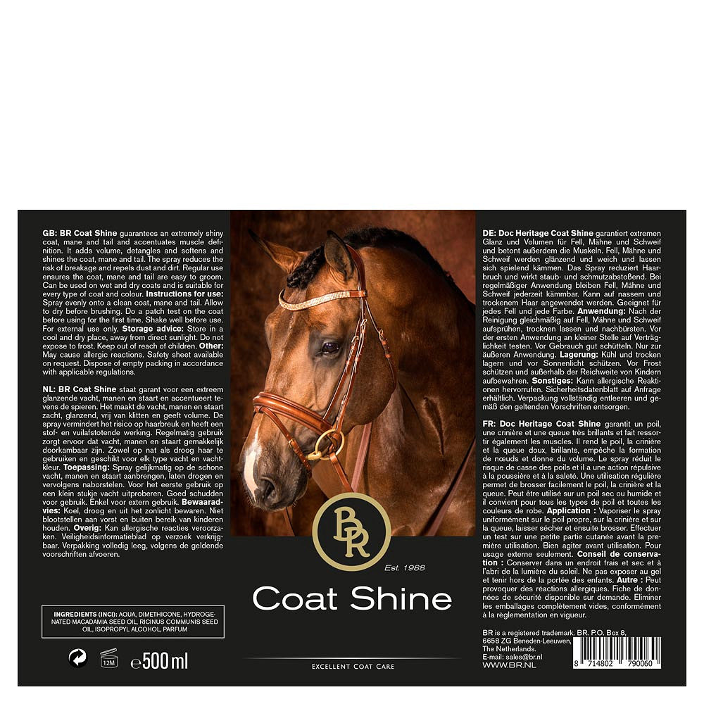 BR glansspray met natuurlijke oliën, macadamia notenolie en wonderolie staat garant voor een extreem glanzende vacht, manen en staart en accentueert tevens de spieren. Het product maakt de vacht, manen en staart zacht, glanzend, vrij van klitten en geeft volume. De spray vermindert het risico op haarbreuk en heeft een stof- en vuilafstotende werking. Regelmatig gebruik zorgt ervoor dat vacht, manen en staart gemakkelijk doorkambaar zijn en beschermt tegen stof en vuil. Zowel op nat als droog haar te gebruiken en geschikt voor elk type vacht en vachtkleur.