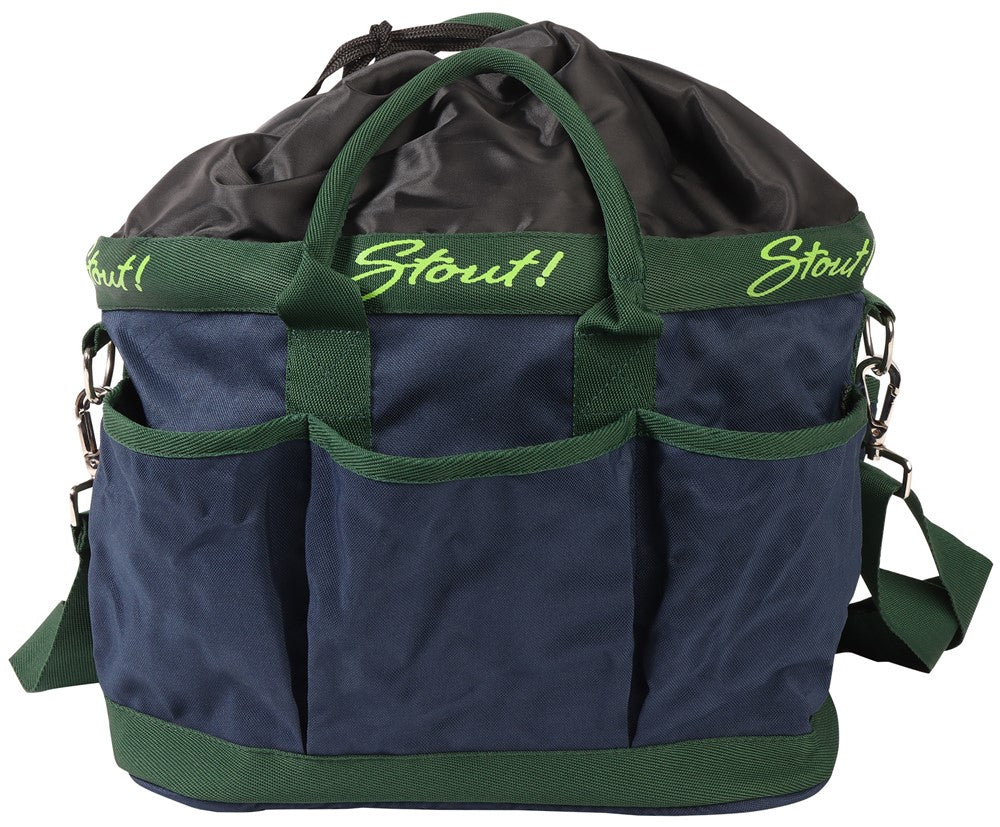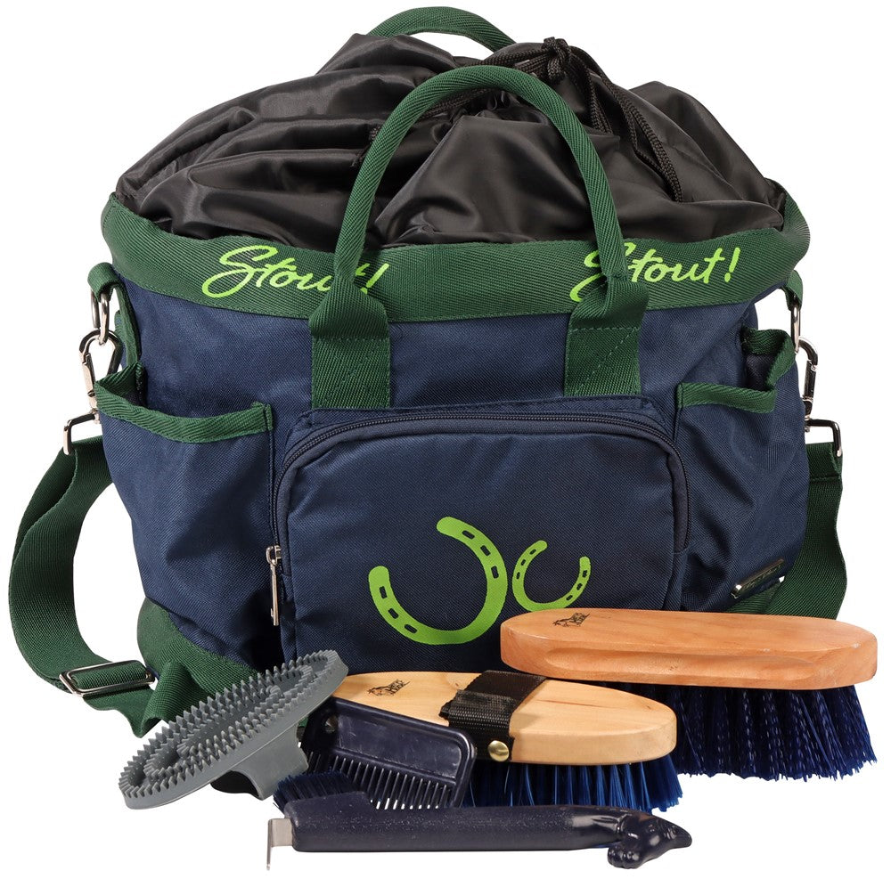 Poetstas met een koordsluiting en diverse vakken aan de buitenkant. Voorzien van leuke gekleurde details en het STOUT! logo op de zijkant. Compleet met een rubberen rosborstel, harde borstel, hoevenkrabber, glansborstel en een manenkam.