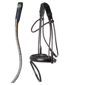 Symmetrisch hoofdstel met zacht gevoerd, afneembaar kopstuk met vier klittenbandsluitingen. De bakstukken en de neusriem zijn aan de bovenzijde van het kopstuk verstelbaar. De keelriem is verstelbaar met één gespsluiting aan de onderzijde. Hierdoor zijn er geen gespen zichtbaar aan de zijkant van het paardenhoofd. Het hoofdstel is voorzien van een rondgenaaid frondeel met een gedeeld kopstuk. Het hoofdstel wordt geleverd met een extra frondeel. Dit gebogen frondeel is voorzien van studs en een ketting met imitatie diamanten met een gedeeld kopstuk en het is met zacht leder onderlegd. De brede, gecombineerde aansnoerneusriem (circa 3.5 cm) is rond gebombeerd, zacht gevoerd en voorzien van een brede, zacht gevoerde kaakbeschermer. Frondeel, neusriem, keelriem en bakstukken zijn van rondgenaaid leder. Het hoofdstel is voorzien van blinde sluitingen en ronde, glanzende, zilverkleurige fournituren. Exclusief teugel.