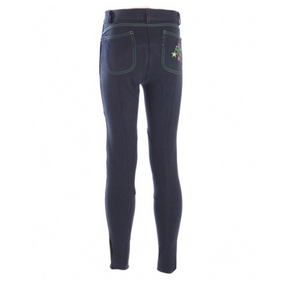 Premiere kinderrijbroek Ambrosia is een strak model kinderrijbroek, 5-pocket model. Op de achterzak bevindt zich een paardenhoofd applicatie met een imitatie diamant. De broek is voorzien van stoffen kniestukken (SKP), een rondgenaaid zitvlak en een klittenbandsluiting aan het uiteinde van de broekspijp. Vervaardigd van 95% katoen/ 5% Spandex, gebreide kwaliteit met contrasterend stiksel in twee kleuren.
